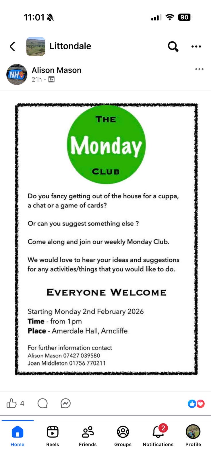 Do you fancy getting out of the house for a cuppa, a chat or a game of cards? Come along and join the weekly Monday Club to be held at Amerdale Hall from 1.00pm.
