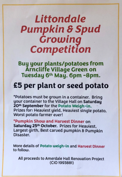 Pumpkin Show and Harvest Supper to be held in the Hall on Saturday 25th October (more details TBC). Prizes for the heaviest, largest girth and disaster class, as well as carved pumpkins and most imaginative. All entries must be grown in Littondale.