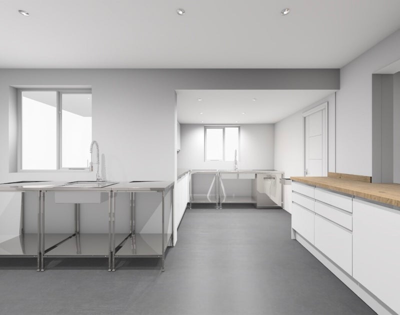We'll add a small extension to connect the bar and existing kitchen. This space will include a new dishwasher, sinks, and storage.