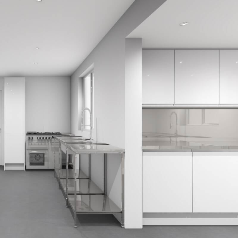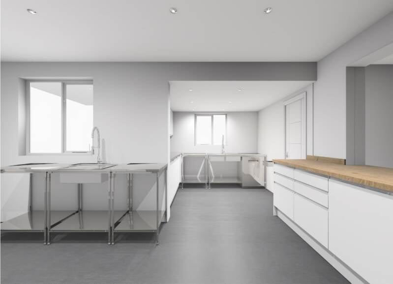 We'll add a small extension to connect the bar and existing kitchen. This space will include a new dishwasher, sinks, and storage.